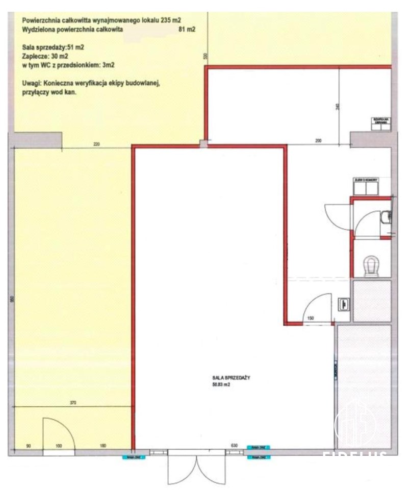 - Zaplecze – 30 m², w tym WC z przedsionkiem ok. 3 m²