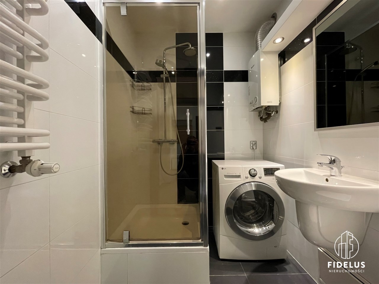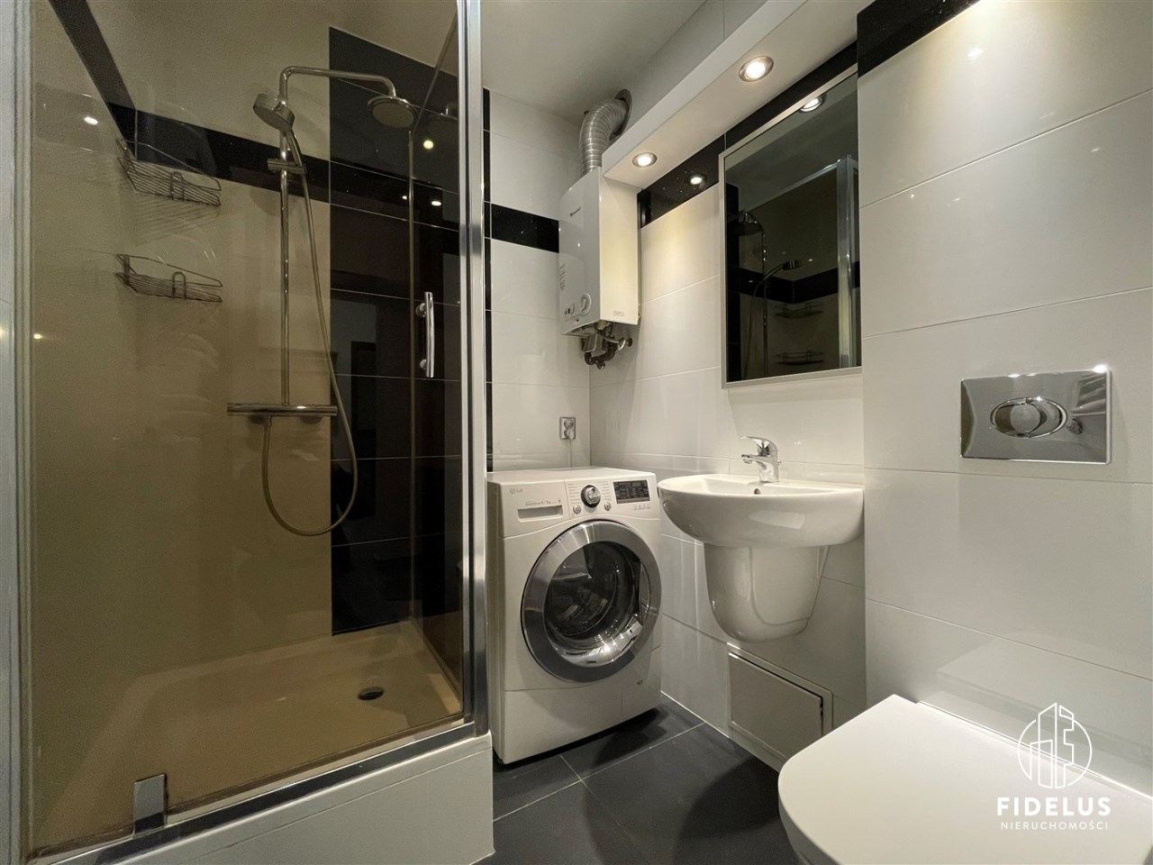 - łazienka w nowoczesnej aranżacji z prysznicem
