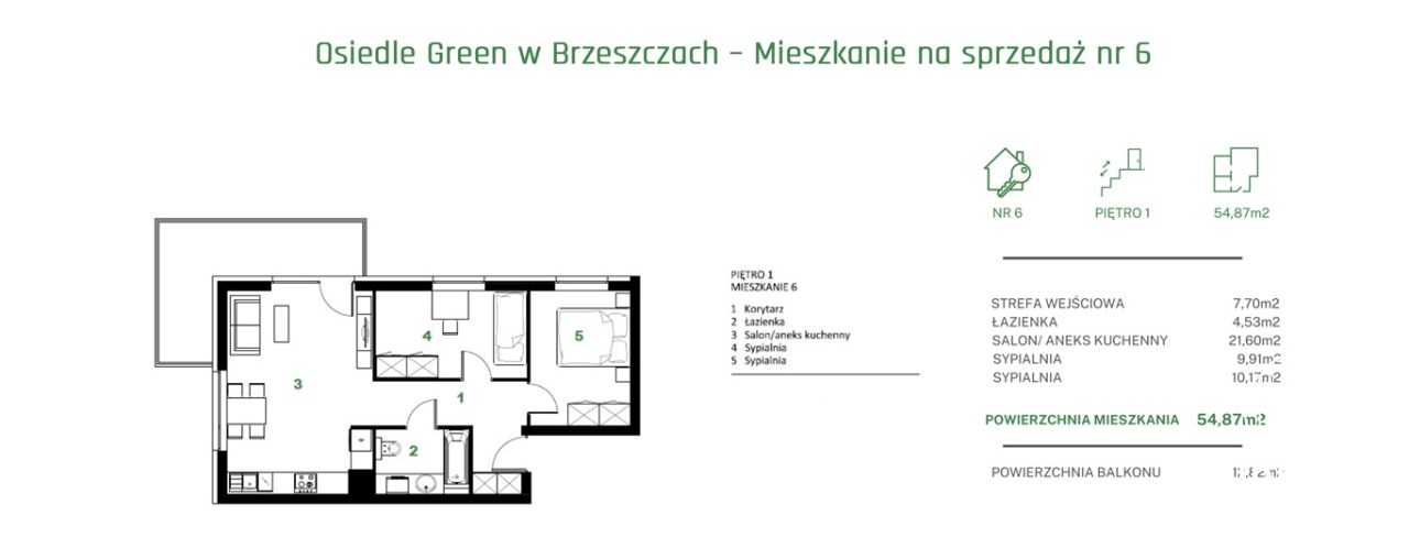 Całkowita powierzchnia wynosi 52,89 m² i znajduje się na 1 piętrze pięciokondygnacyjnego apartamentowca z 2025 r.