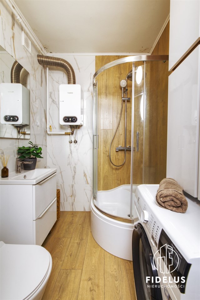 - Łazienka z kabiną prysznicową, umywalką oraz pralką.