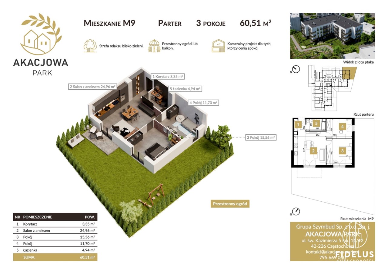 Akacjowa Park to kameralna inwestycja mieszkaniowa realizowana przez Grupę SZYMBUD – doświadczonego dewelopera z 13 zakończonymi projektami i ponad 600 przekazanymi mieszkaniami m.in. w Częstochowie i Cieszynie.