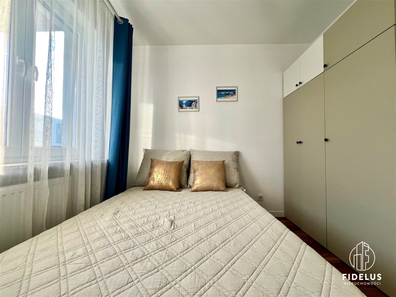 sypialnia z dużym łóżkiem oraz pojemną szafą w zabudowie,
