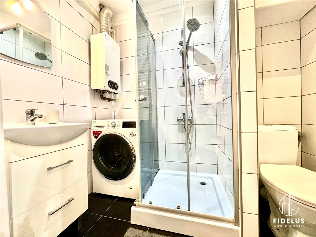 - łazienka z WC, kabiną prysznicową oraz pralko-suszarką.